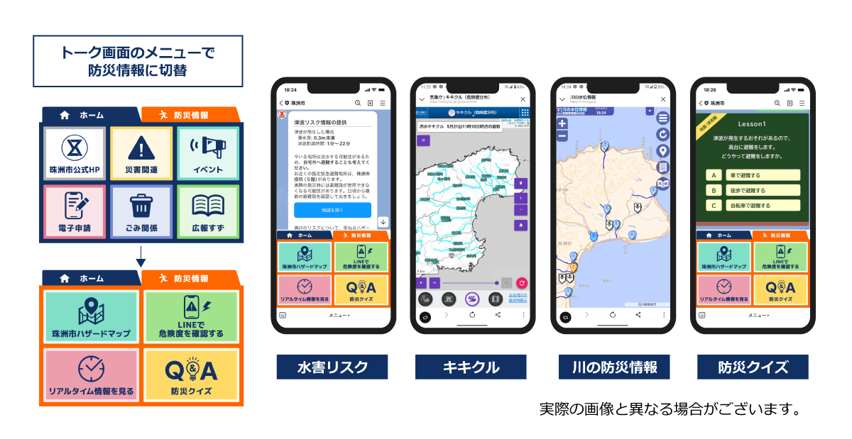 ・ハザードマップの水害リスク表示・・・GPS(位置情報サービス)の機能を利用し、津波、土砂災害、洪水のリスクをLINEのトーク画面に表示