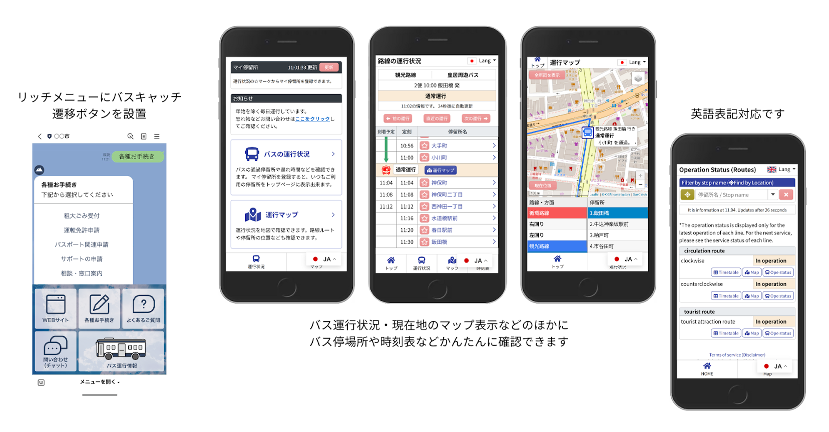 英語対応により、訪日外国人がGoogleマップやLINEで公共バスの運行情報を確認し、スムーズな観光が実現。