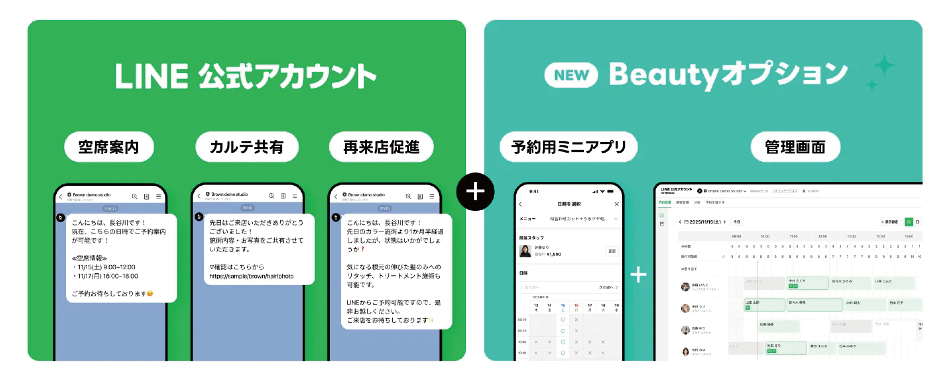 LINEビューティープラスとは、LINE公式アカウントと新登場の「Beautyオプション」を組み合わせたヘアサロン向けパッケージです。予約から顧客管理、メッセージ配信までをLINE上で実現。失客を防ぎながらリピートにつなげることができます。