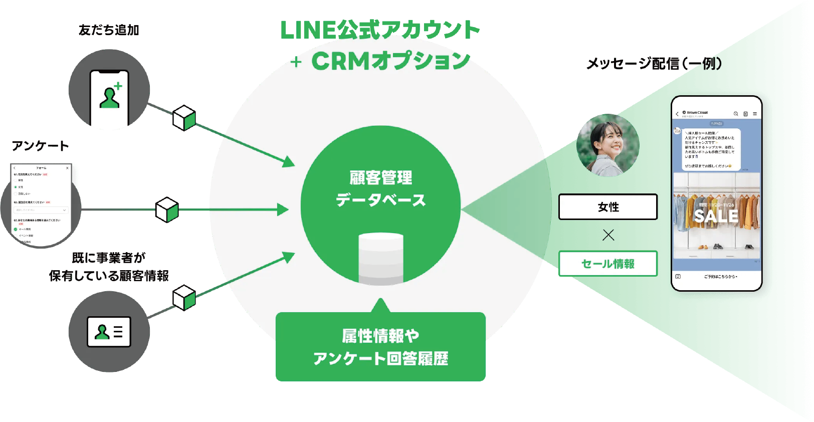 CRMオプションは、LINE公式アカウント上で事業者の顧客情報(委託の範囲に基づく)を管理し、顧客一人ひとりに合わせたコミュニケーションを可能にするオプション機能です。顧客の属性やステータスに合わせたメッセージなどを通して、顧客との継続的なつながり作りを実現します。