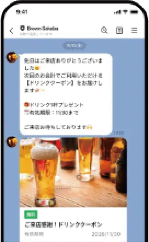 来店情報やモバイルオーダーの注文データを活用し、メッセージ配信やクーポン配信などの顧客対応ができます。