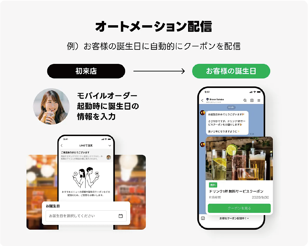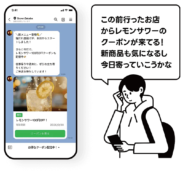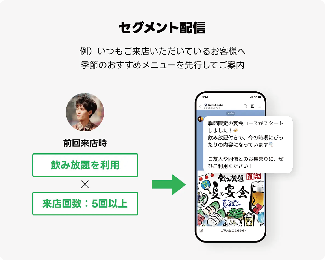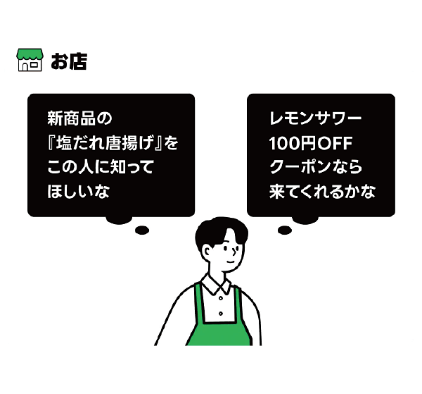 来店日時や注文内容などのデータを活用して、LINE公式アカウントでお客様に最適なメッセージを届けられます。配信設定は専門チームが伴走し、常連づくりにつながる知見も共有します。
