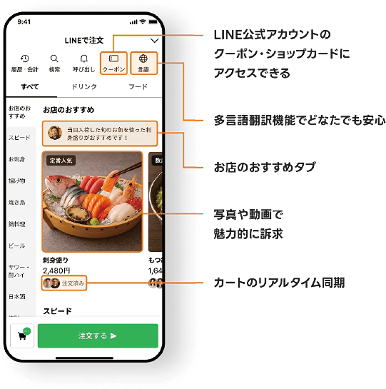 注文に必要な基本機能を備えているだけでなく、おすすめ表示や動画メニュー、LINE公式アカウントのクーポン・ショップカードへの導線などにより、選びやすくもう一品頼みたくなる注文体験を実現します。