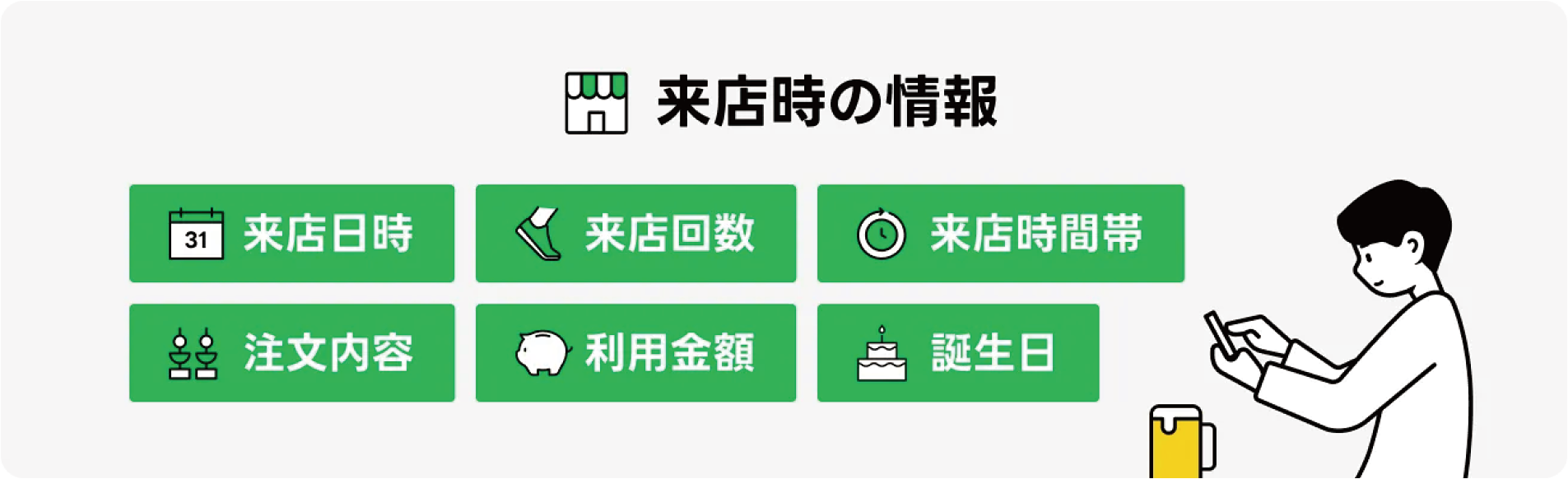 ハンディ・POS画面上で、初来店・リピート・常連を把握でき、お客様一人ひとりに合わせた接客をサポートします。