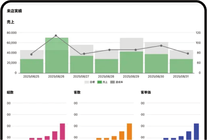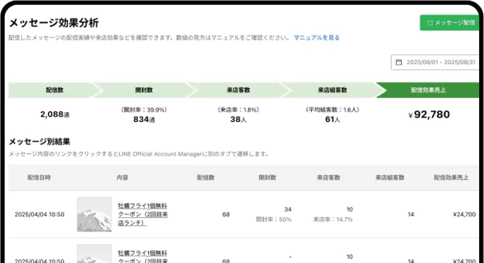 売上データからメッセージ配信の効果、お客様のアンケート結果まで、店舗の状況をまとめて把握できます。
